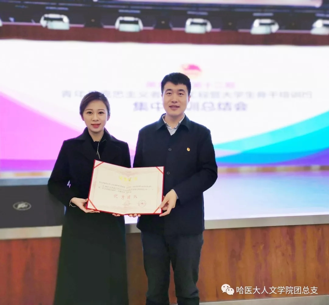 ac米兰官网中文网站团委王曦书记上台领奖 此外,本次表彰大会与黑龙江省第十二期“青年马克思主义者培养工程”暨大学生骨干培训班集中总结会同时进行。经过团省委、省学联严格的闭卷考试和资格审核,ac米兰官网中文网站公共卫生学院李珂心、我院修小惠、生物信息科学与技术学院申家莉、大庆校区刘明慧、张西媛共五名学生以优异成绩顺利成为培训班正式成员。经过为期5天的集中学习培训,学员们不仅提高了思想政治素质、政治理论水平、团队合作意识,更明确了今后努力的方向,更加坚定了做马克思主义的信仰者、传播者、践行者的信念,在理论学习和实践锻炼中均受益匪浅。
