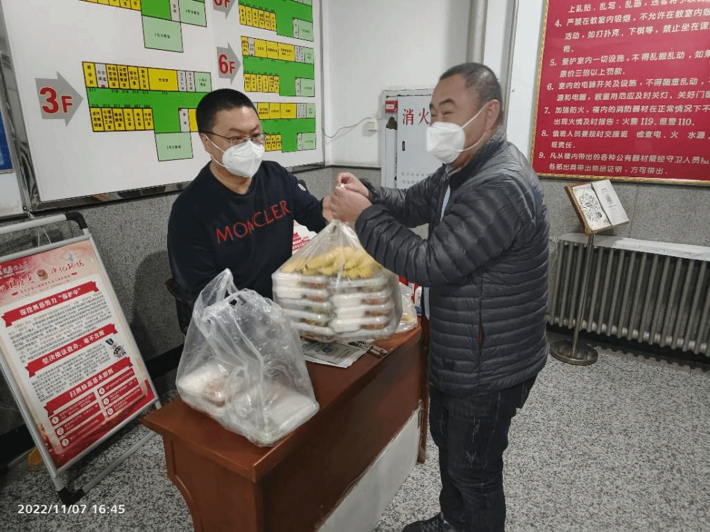 第三,积极做好成教楼六十余名疫情防控工作人员一日三餐的盒饭发放工作。本次疫情防控工作中,学校无偿提供了成教楼疫情防控工作人员的一日三餐。但是社区流调工作人员的工作是彻夜不眠的,为了做好服务工作,保证流调工作人员能有更好的体力应对工作,我主动与学校食堂沟通,早上六点就起床为社区流调工作人员配发早餐。