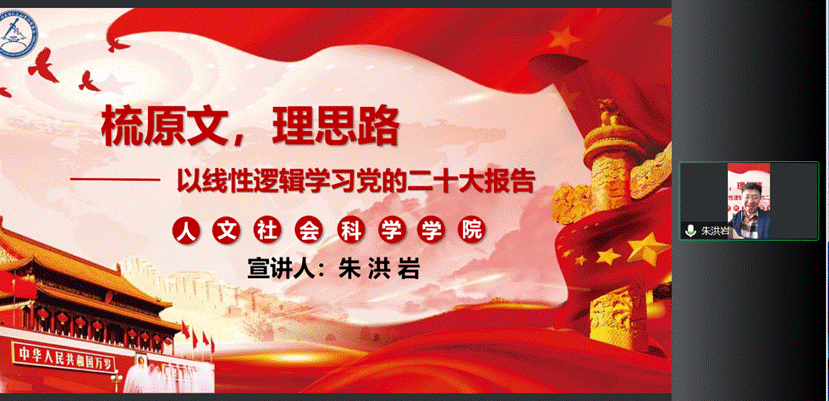 人文学院副院长朱洪岩教授以《梳原文,理思路——以线性逻辑学习党的二十大报告》为题,从二十大报告的主要内容、围绕“一”“二”“六”“十”“十一”“十二”“二十”这些数字的意义,宣讲二十大精神。