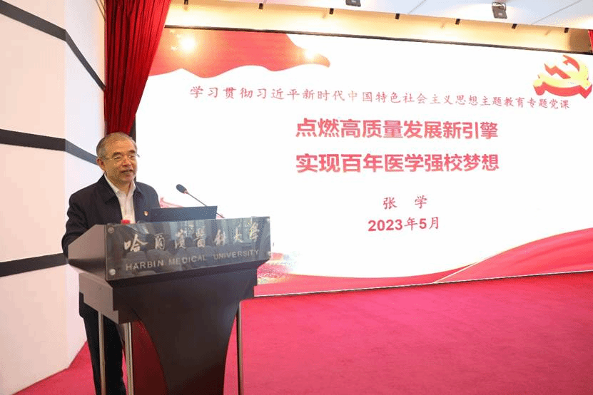 按照学校党委关于主题教育的工作安排,5月30日下午,校党委书记、校党委学习贯彻习近平新时代中国特色社会主义思想主题教育领导小组组长张学以《点燃高质量发展新引擎 实现百年医学强校梦想》为主题作专题党课。他强调,要全面学习领会习近平新时代中国特色社会主义思想,全面系统掌握这一思想的基本观点、科学体系,把握好这一思想的世界观、方法论,坚持好、运用好贯穿其中的立场观点方法,不断增进对党的创新理论的政治认同、思想认同、理论认同、情感认同,真正把马克思主义看家本领学到手,自觉用习近平新时代中国特色社会主义思想武装头脑、指导实践、推动工作,为奋进新征程、建功新时代提供坚强有力的政治引领和政治保障。
