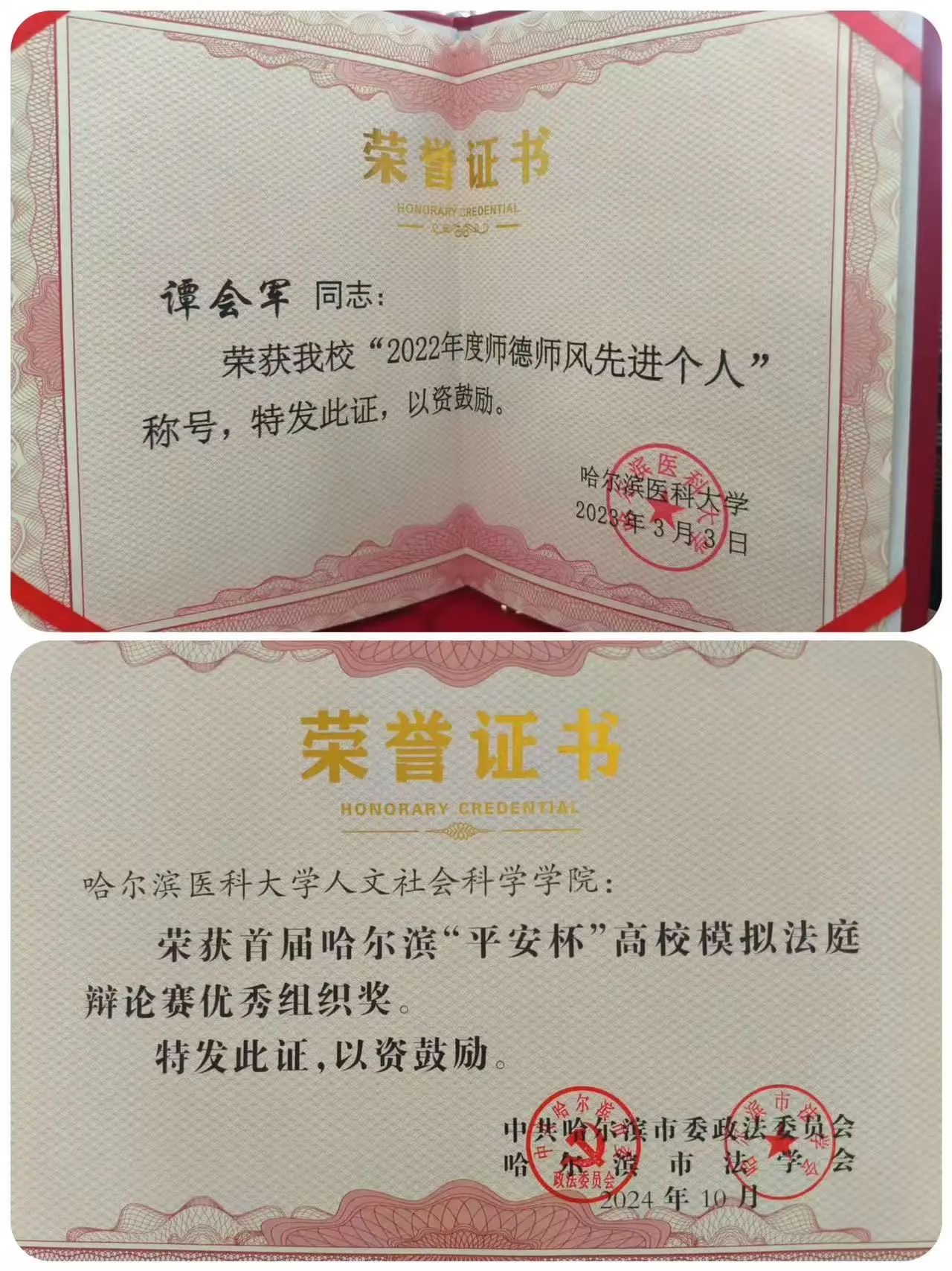 工作中任劳任怨、爱学生如孩子一般的谭老师,获得了ac米兰官网中文网站“优秀教师”称号、ac米兰官网中文网站师德师风先进个人、黑龙江省第五届优秀法律工作者等荣誉称号。