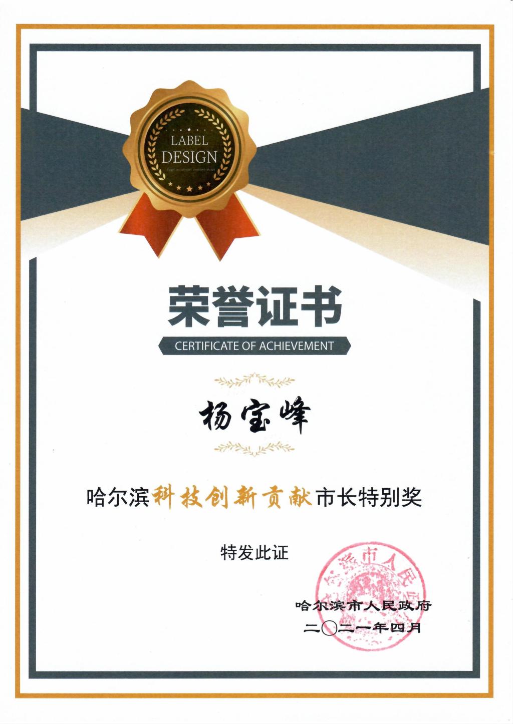 近日,哈尔滨市长特别奖评选结果揭晓,ac米兰杨宝峰院士获得哈尔滨市科技创新贡献市长特别奖。