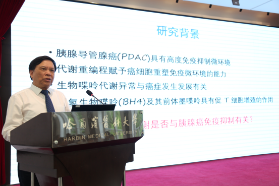 林东昕院士的报告题目为“生物喋呤代谢异常驱动胰腺癌免疫抑制”,为与会者带来肿瘤研究领域的最新进展。其最新研究结果表明,胰腺癌因醌二氢喋呤还原酶(QDPR)失活致其生物喋呤代谢异常导致胰腺癌形成免疫抑制微环境,从而逃逸免疫抑制并抵抗免疫检查点阻断剂的治疗。该成果首次揭示肿瘤细胞生物喋呤代谢对肿瘤免疫的调控作用,为克服胰腺癌免疫治疗抵抗提供了新思路。