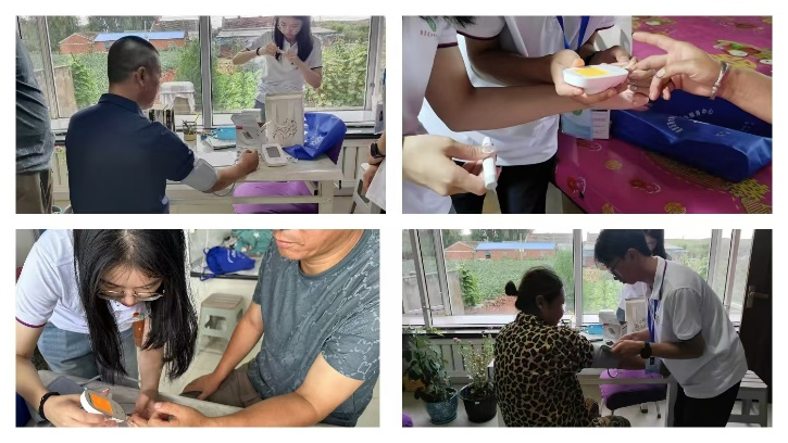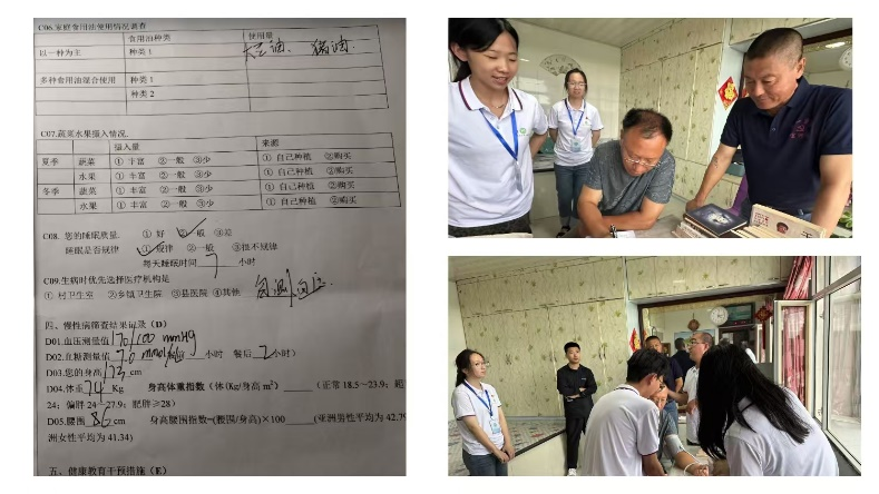 除此以外,志愿者们在老师的指导下还熟练地掌握了测量血压、血糖的技术。此次活动,同学们对农村防治高血压、糖尿病现状有了深入直观地了解。在进行健康问卷调查过程中,我们积累了与人交流沟通的技巧。通过对相关医学问题的思考,同学们也进一步拓宽了科研思路。