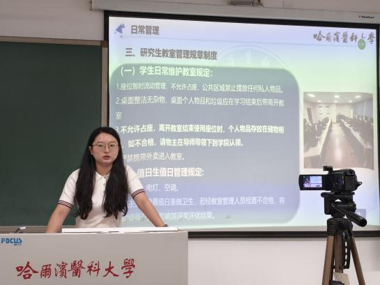 学生工作办公室负责研究生管理工作的马祎老师介绍了研究生资助政策、奖学金评定要求等相关事宜;研究生辅导员董威兰老师向同学们介绍了学院研究生党(团)总支,学院研究生会及研究生相关日常管理制度。