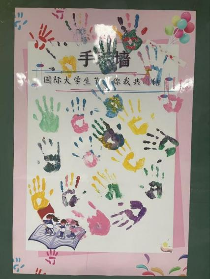 同学们在游戏结束之后,纷纷在国际大学生节宣传海报上留下了自己的手印,这些手印见证了同学们今晚的愉快时光,见证了伙伴之间的友谊。