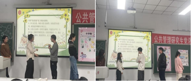本次活动分为自我介绍、观看宣传片、团队游戏、“手印墙”以及“纸短情长,心桥相连”五个部分。11月18日下午5点30分,主持人致开场词并宣布活动正式开始。首先董老师与同学们进行亲切交谈,她表示希望借助本次活动为师生提供一个交流互动的平台,帮助同学们更快地融入卫生管理学院这个大家庭中,鼓励同学们在日常学习与生活中团结友爱、互帮互助,进一步展现卫生管理学院的学生风采。