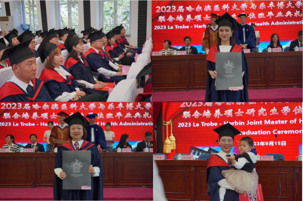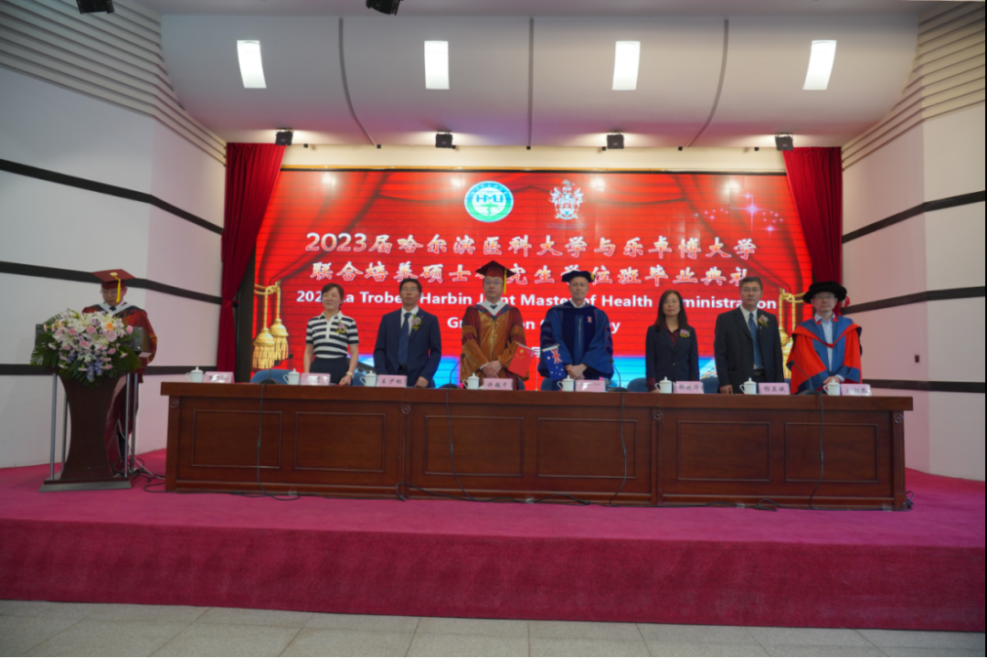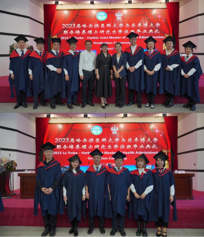 2023年9月15日,2023届ac米兰官网中文网站与澳大利亚乐卓博大学联合培养卫生管理硕士研究生毕业典礼在ac米兰官网中文网站主楼三楼报告厅隆重举行。ac米兰官网中文网站副校长许超千教授、副校长高彦辉教授、澳大利亚乐卓博大学心理与公共卫生学院院长斯蒂芬.肯特教授、副院长刘朝杰教授、黑龙江省教育厅对外合作与交流处王少松处长、黑龙江省卫生健康委员会对外合作处柳青副处长、国际交流合作处钟照华处长、国际教育学院院长杨立斌教授、卫生管理学院院长郝艳华教授、副院长焦明丽教授、项目的授课和管理教师及学院师生、部分毕业生家属百余人参加典礼。