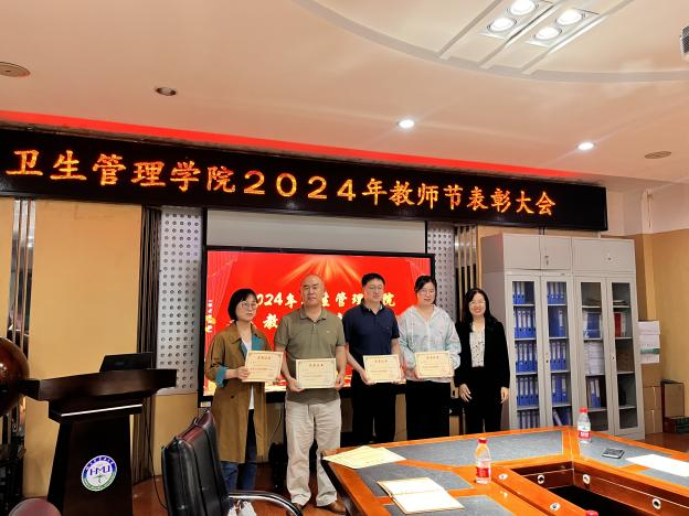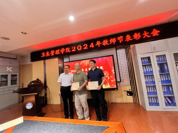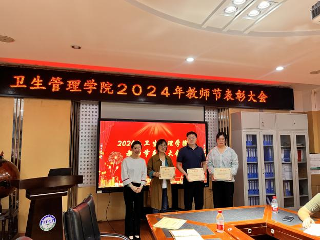 首先,卫生管理学院院长郝艳华在会上宣读了表彰决定。分别由公共卫生学院党委书记刘振华、院长郝艳华、副院长焦明丽为获得“优秀教师奖”、“优秀青年教师奖”、“教学突出贡献奖”、“优秀教学管理者奖”、“优秀论文指导教师奖”、“优秀竞赛指导教师奖”、“教学竞赛标兵奖”的教研室和教师颁奖并合影留念。