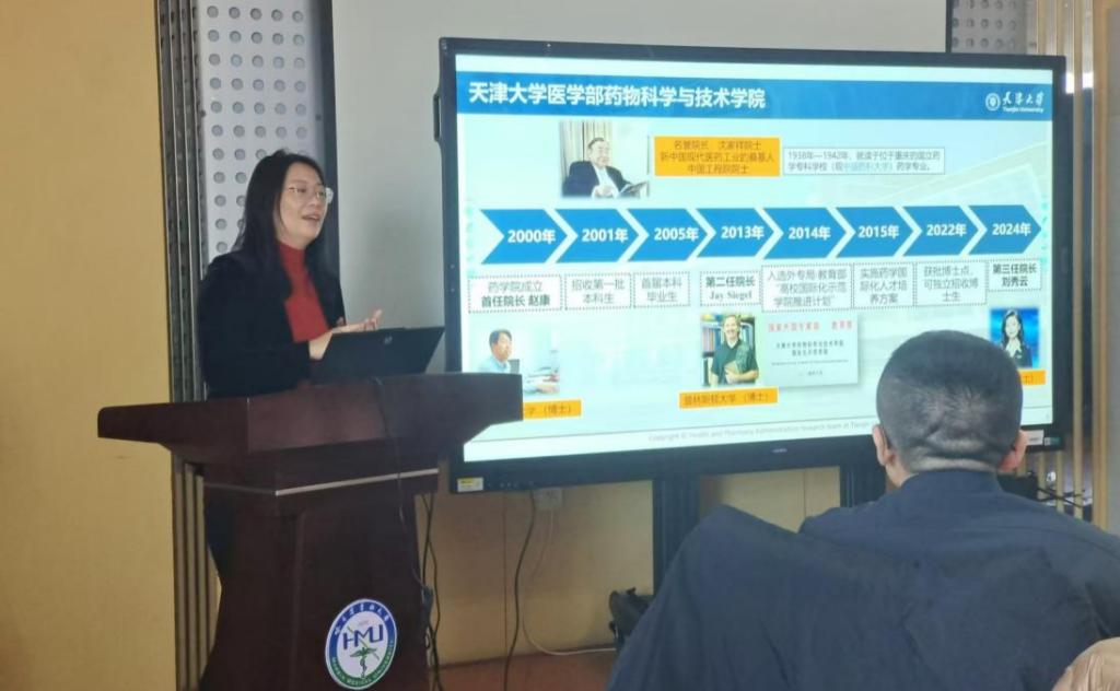 天津大学药物科学与技术学院党委书记吴晶教授在介绍了学院的基本情况后,又详细介绍了卫生事业与药事管理团队,包括团队成员、研究方向、研究成果以及专业服务等方面。