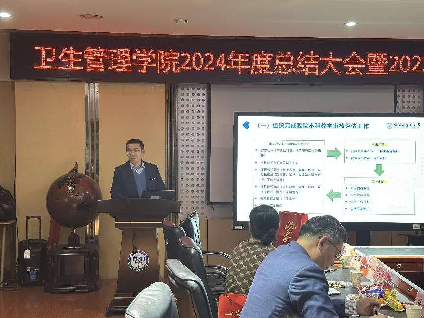 卫生管理学院教学副院长康正对教育教学成果进行了总结和规划,同时高度赞扬了各教研室,学院办公室等部门勠力同心的优良品质,并希望全体教职工站好最后一班岗,做好最后一件事。最后康院长祝学院全体师生新年快乐,踔厉奋发,愿学院2025年创造更辉煌的成绩。