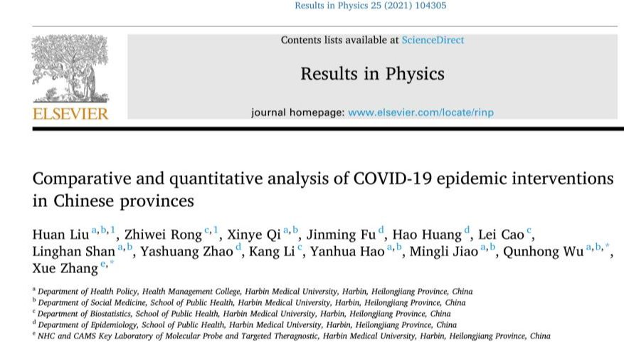 2021年,ac米兰官网中文网站吴群红教授团队在《Results in Physics》杂志上发表了一篇论著,开发了一个数学模型,以评估和比较中国各省2019冠状病毒病防控措施的效果和强度。使用动态模型描述了政府干预下疾病的时间过程。估计的政府干预参数和干预前后的面积差异分别被视为干预强度和效果。