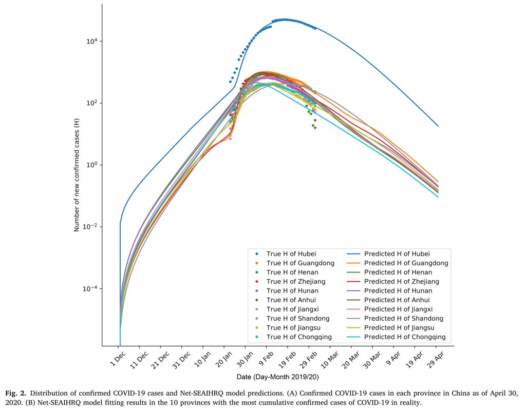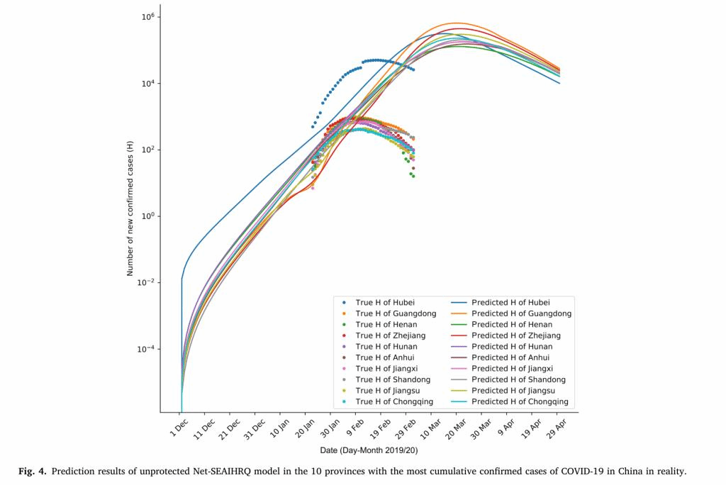3、无干预措施下Net-SEAIHRQ模型预测中国大陆的疫情情况:模型预测结果显示,若没有控制措施,至4月30日,中国的确诊病例将达到4300万。另外研究发现,疫情防控措施对经济发达的省份效果更为突出。