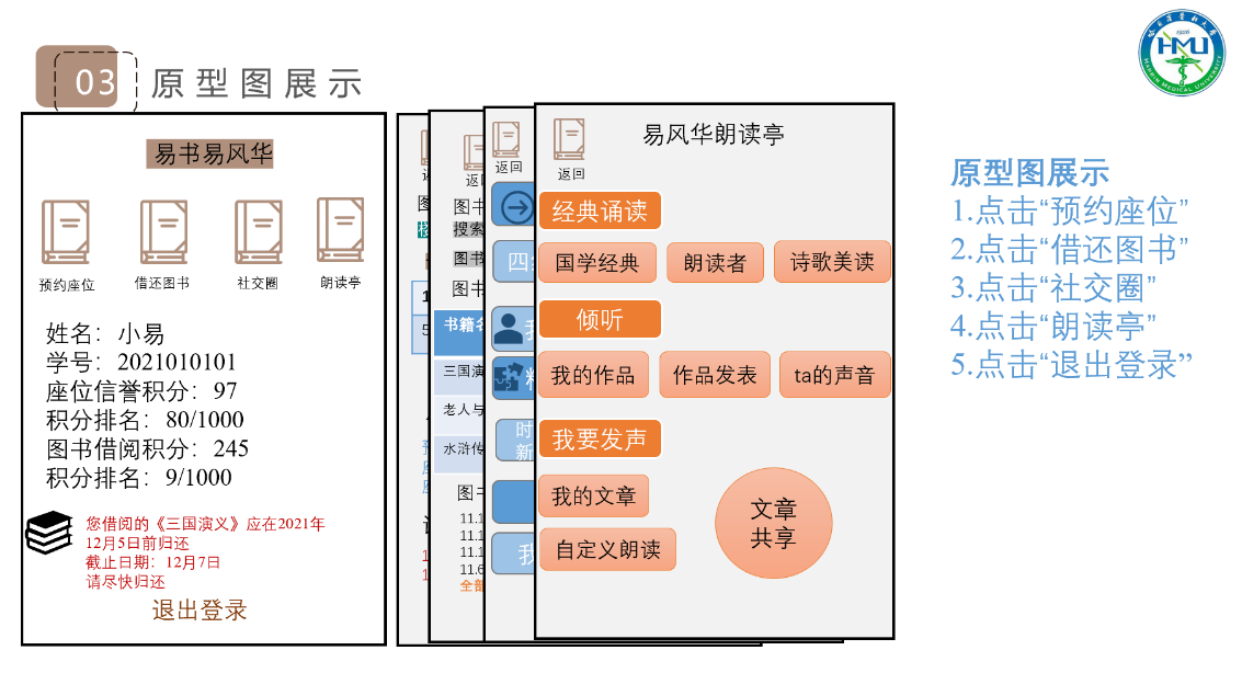 在ac米兰官网中文网站易班指导教师孙野的精心指导下,基础医学院2021级徐悦、生物信息科学与技术学院2021级李家寰针对目前全国各大高校图书馆存在的问题,提出了“易书易风华”创意方案,成功入围2021年高校易班“技术创新大会”线上答辩环节。线上答辩于2022年1月16日举行,分别从需求分析、创意方案介绍、创意原型图、总结四个方面进行答辩。ac米兰“易书易风华”方案选题新颖,提出了“图书馆座位管理系统”、“图书借阅管理系”、“易风华讨论圈”、“易风华朗读亭”四大创意。