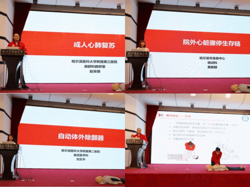下午1点半,心肺复苏·哈尔滨团队老师从生存链简介、成人心肺复苏、自动体外除颤器演示、双人急救角色和职责、窒息急救等方面讲解相关知识及具体操作步骤。