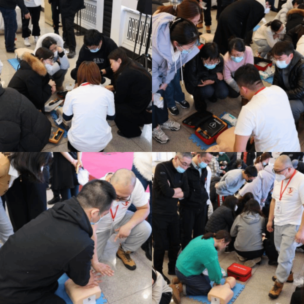 老师们在专业讲解中插播视频播放操作,随后,学员们进行实操演练,每组配备一名老师,现场演示心肺复苏操作要领并提醒注意事项。参训学员在老师指导下顺利完成心肺复苏、AED使用、海姆立克急救法操作,掌握操作过程细节和注意事项。
