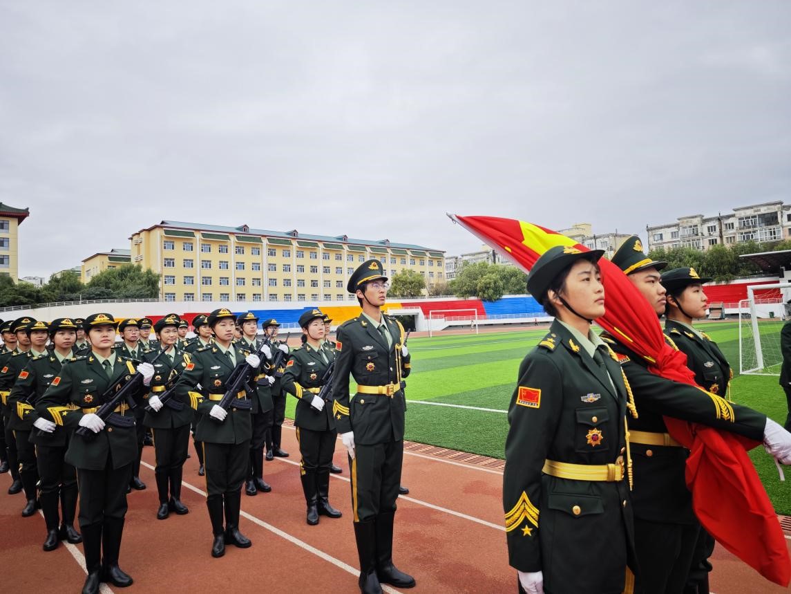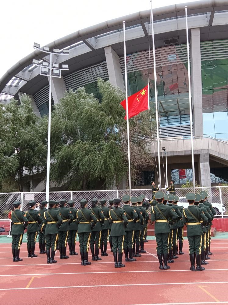 国旗护卫队迎着朝阳,迈着铿锵有力的步伐走向升旗台;庄严的国歌声响彻整个校园,鲜艳的五星红旗迎风飘扬,冉冉升起,全体观礼人员肃然而立,满心皆怀爱国情,共祝伟大祖国巍巍山河永昌、国家繁荣富强。