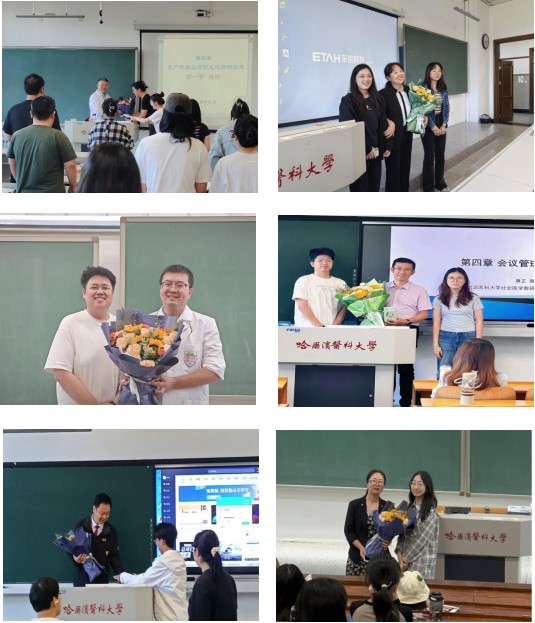 在辅导员荣休与入职仪式环节,公共卫生学院王冶艳老师和基础医学院王玉清老师的荣休视频回顾了两位辅导员的工作点滴,学校为两位老师颁发奖杯、鲜花和纪念品。两位老师送给新入职辅导员钢笔和书籍,寓意薪火相传,托付光荣使命。东梅代表学校向两位荣休辅导员表达敬意和感谢,对新入职辅导员寄予希望和嘱托。