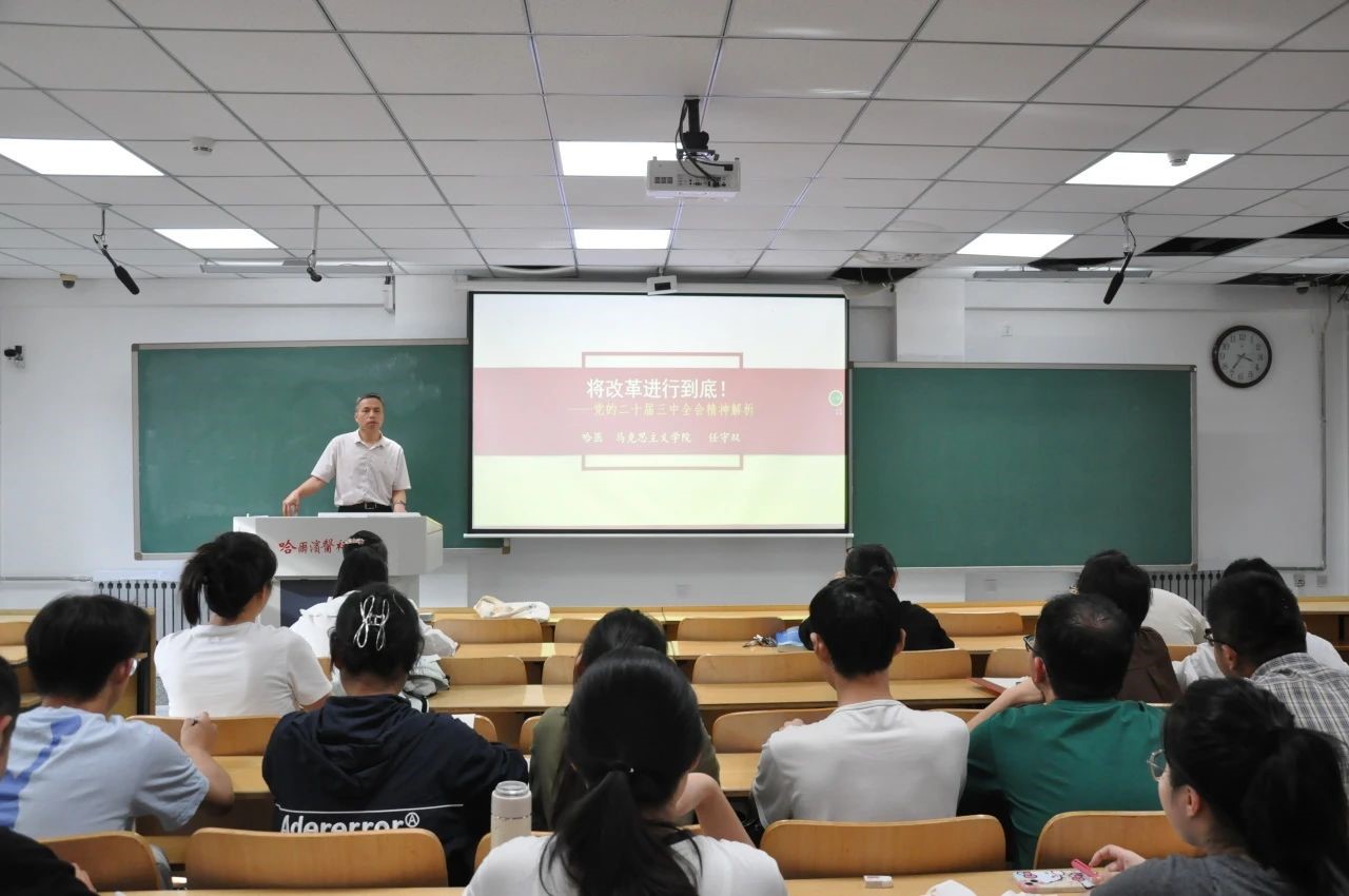 药学院 举办第六期“药苑红医大讲堂”,邀请任守双教授作《将改革进行到底!党的二十届三中全会精神解析》专题讲座,为学院师生开展了一场紧跟时事,功底扎实,深入透彻的专题讲座。他分别从全会概况、历史沿革、全会内容、全会精神的龙江ac米兰实践四个部分进行讲解,全面系统阐述了二十届三中全会的基本情况和深刻内涵。