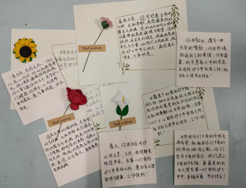 点燃天使红烛梦,传承百年护理情。人类健康事业的发展,离不开一代代护理人的坚守与传承。一张张精致的明信片,真挚的节日祝福跃然纸上,有同学们一路以来的收获与感恩,亦饱含真切地祝愿与承诺。在这个草长莺飞的五月,我们将最美的文字献给最美的人。