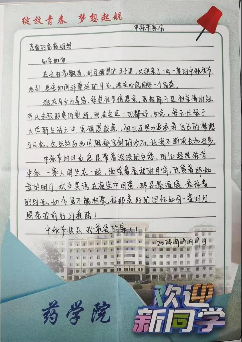 金秋九月,桂子飘香,为缓解离家学子心中的思念和远在他乡家人内心的牵挂,加强新生与家长的情感沟通,培养新生感恩意识,责任意识以及健全人格,药学院特举办此次“新起点,信相连,心沟通”主题写家信活动,山海有距,亲情无间,虽所爱相隔山海,但关爱永在心头。