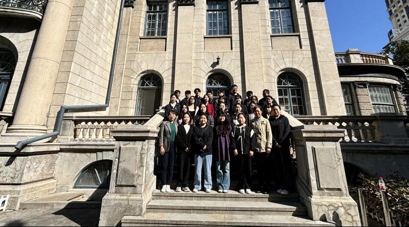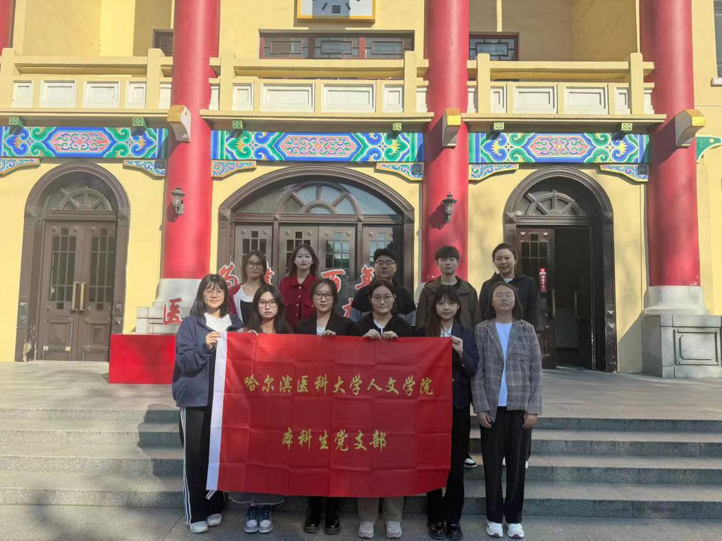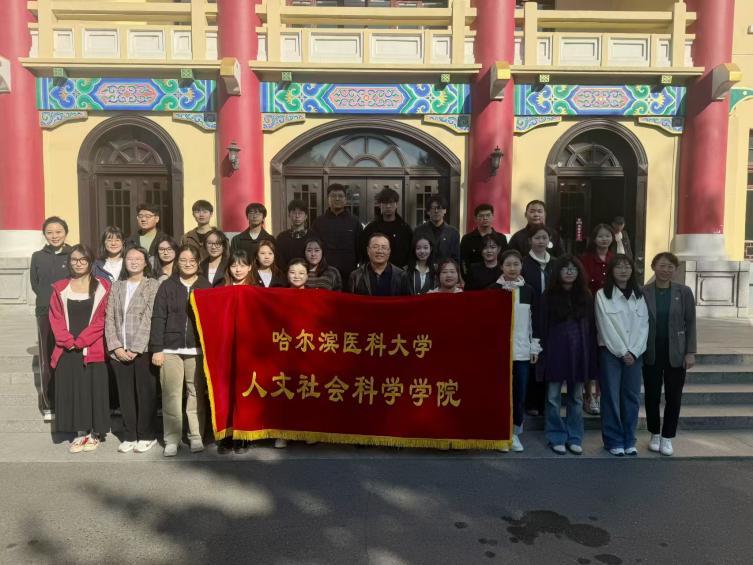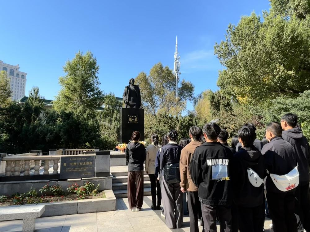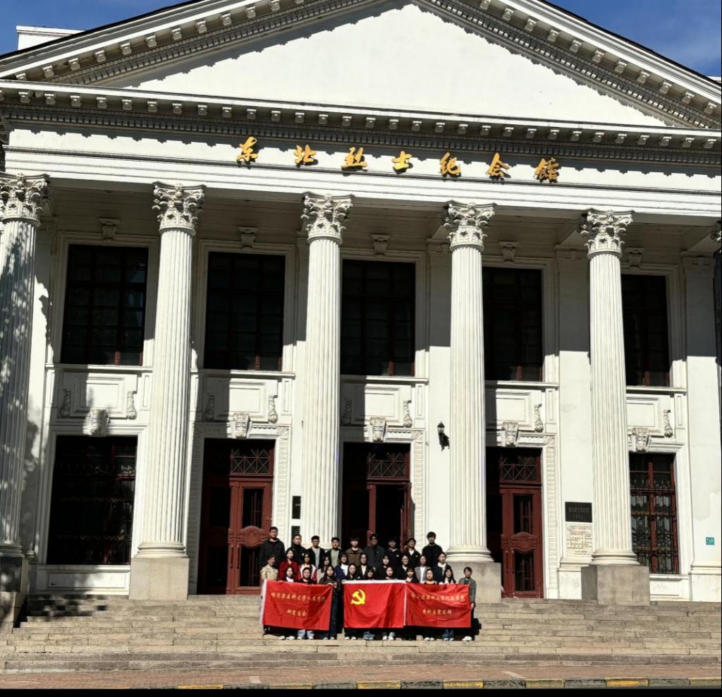 最后,学院师生又徒步至东北烈士纪念馆。在馆前进行合照,并共同进馆参观。东北烈士纪念馆内地上一层主要通过图片介绍解放战争时期牺牲的英雄。地上二层的展柜里摆放着英雄们用过的衣物、枪支,墙上挂着一位位烈士的照片、画像,下方写有他们英雄事迹的介绍和生卒年月。地下一层是“伪满洲国哈尔滨警察厅旧址及罪恶展”,展览分为“魔网”“罪恶”“覆灭”三部分,展示了伪满洲国哈尔滨警察厅当年的残暴统治。