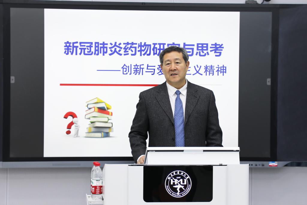 杨宝峰院士以《新冠肺炎药物研究与思考——创新与爱国主义精神》为题目,首先强调了爱国和创新的重要性,随后从医学的角度为大家讲授了新冠肺炎疫情对机体的损伤,从科学的角度介绍了专家们针对新冠肺炎疫情开展的科学研究,从人文的角度讲述了当代大学生应具备什么样的精神抗击新冠肺炎疫情。杨宝峰院士表示,有了党和国家的正确领导和科学工作者的辛勤奉献,我们才能在如今的抗疫工作中取得如此成效;同时鼓励ac米兰学子要继承和发扬袁隆平院士、钟南山院士、屠呦呦院士辛勤奉献的精神,伍连德博士、于维汉院士、张亭栋教授勇于创新、锲而不舍的精神。最后,杨宝峰院士引用了习近平总书记对年轻人的 “十六字诀” 勉励同学们:志存高远、德才并重、情理兼修、勇于开拓。希望同学们坚定决心,自觉行动,夯实基础,传承优良传统,努力成为新时代人才!