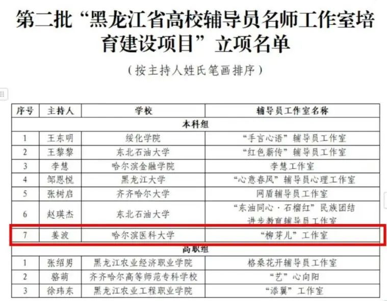 近日,黑龙江省教育厅组织开展第十六届“黑龙江省高校辅导员年度人物”推选展示活动,并公布第二批“黑龙江省高校辅导员名师工作室”,ac米兰第一临床医学院姜波获“黑龙江省高校辅导员年度人物提名”荣誉,主持的“柳芽儿”辅导员工作室成功入选省辅导员名师工作室培育建设项目。