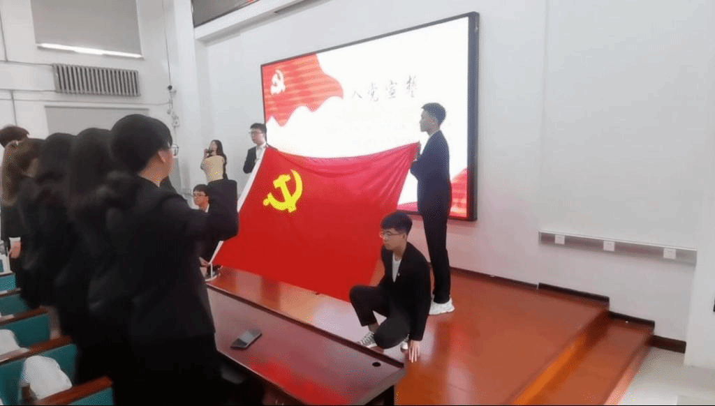 在领誓人的带领下,所有党员、预备党员全体起立,身着正装,高举右手,郑重的许下庄严的宣誓词。表达对党和红旗最高的崇敬和忠诚。宣誓完毕,主持人致辞,宣讲正式开始。