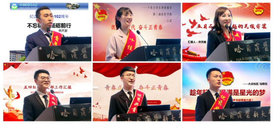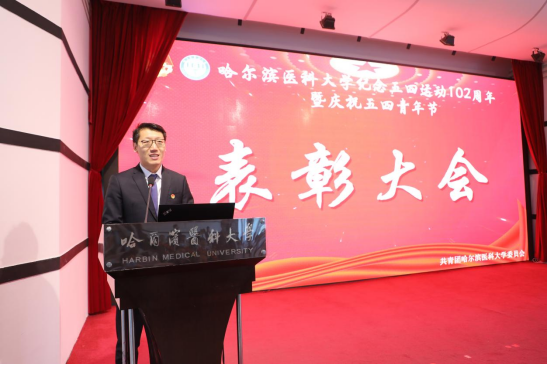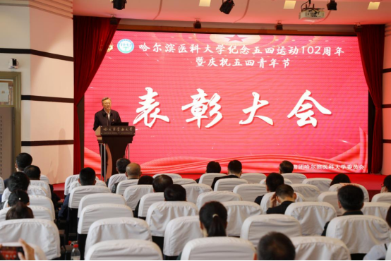 党委副书记袁重胜宣读了学校第二十届第59次党委常委会的决议。王曦宣读了关于表彰“青年五四奖章”“十佳大学生”和“两红两优”的决定。“青年五四奖章”获得者代表公共卫生学院营养与食品卫生教研室教师韩天澍、“十佳大学生”获奖代表第二临床医学院2017级临床医学(“5+3”一体化)学生王晨、“五四红旗团委”获得单位代表第一临床医学院团委书记许天维、五四红旗团支部”获奖支部代表第三临床医学院病理团支部温岩、“优秀共青团干部”获奖代表基础医学院2019级团总支张安、“优秀共青团员”获奖代表大庆校区19级本科马皓玉同学分别进行了发言。他们表示,青年是国家的未来,也是民族的希望和脊梁,要自觉用习近平新时代中国特色社会主义思想武装头脑,继承和发扬五四精神,坚定理想信念,站稳人民立场,练就过硬本领,投身强国伟业,承担起肩上的责任,秉承“木直中绳、博学载医”的校训精神,奋发向上,砥砺前行,用奋斗渲染青春底色,用奉献彰显青春价值。