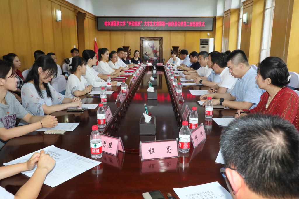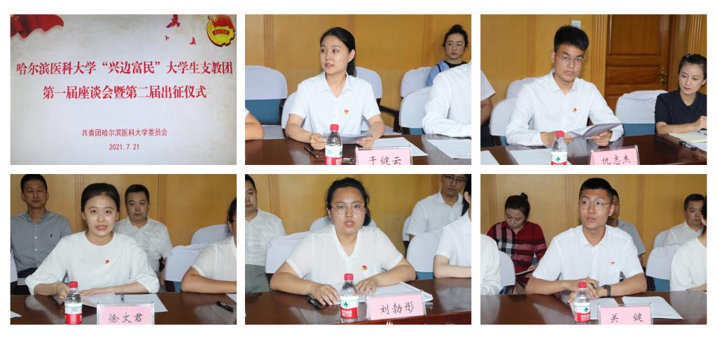 第一届支教团成员依次发言。第一临床医学院2020级眼科学硕士研究生,支教于穆棱市职业技术教育中心学校的于健云说到:在支教度过的每一天,都是自己与青春共同成长的过程,在教学岗位上,给学生更多的知识、更多的爱和更多的自信,让他们羽翼丰满,在走上社会之后展翅高飞。第四临床医学院2020级麻醉学硕士研究生,支教于漠河市实验学校的仇志杰说到:承担的主要科目是住宿生晚自习课堂、幼儿园校医岗、学校食堂部分后勤工作以及幼儿园信息技术提升2.0项目,并表达能成为一名支教教师,是他做得最勇敢的选择,支教生活所焕发的光芒将照亮自己今后的人生道路。第二临床医学院2020级超声医学硕士研究生,支教于漠河市高级中学的徐文君以我心践行医者仁心、以恒心坚守师者本心,主动承担了校医及语文、英语教学岗位,尽自身之力传播医学知识的同时,也始终鼓励自己严守师德、对学生言传身教,得到了学生们的高度认可。第二临床医学院2020级妇产科学硕士研究生,支教于穆棱市共和乡共和中心学校的刘勃彤根据学生的不同情况因材施教,同时结合自己的医学知识,将医学科普小讲堂搬进教室,让医学走入孩子们的日常生活中,使学生们受益良多。第一临床医学院2020级儿童口腔医学硕士研究生,支教于穆棱市共和乡共和中心学校的关健结合自身医学专业的特点,开展了多课时的医学保健科普,同时利用工作日的晚上和周末无偿为初一的孩子辅导数学和英语,他表示自己将25岁青春这一年,最好的自己与最饱满的爱留在了支教服务地,此生无悔。