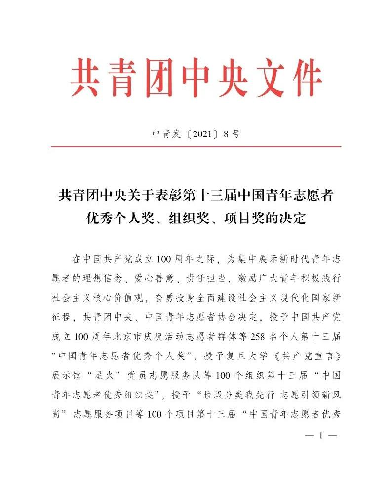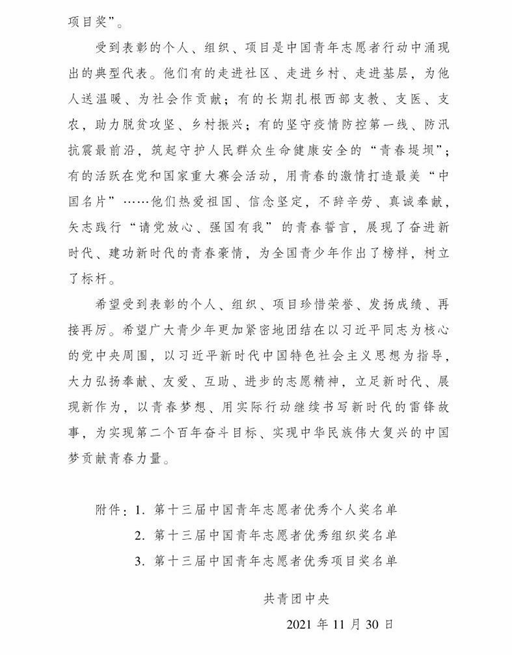据悉,中国青年志愿者优秀个人奖、组织奖、项目奖由共青团中央、中国青年志愿者协会设立,自1996年以来已开展十三届评选表彰活动。本届表彰严格落实参评资格、条件和程序,注重面向基层和一线选树先进典型,注重对重大事件、重点领域中表现突出的个人、组织和项目的激励,展示新时代青年志愿者的理想信念、爱心善意、责任担当,引导广大团员青年在新时代新征程上奋勇建功立业。
