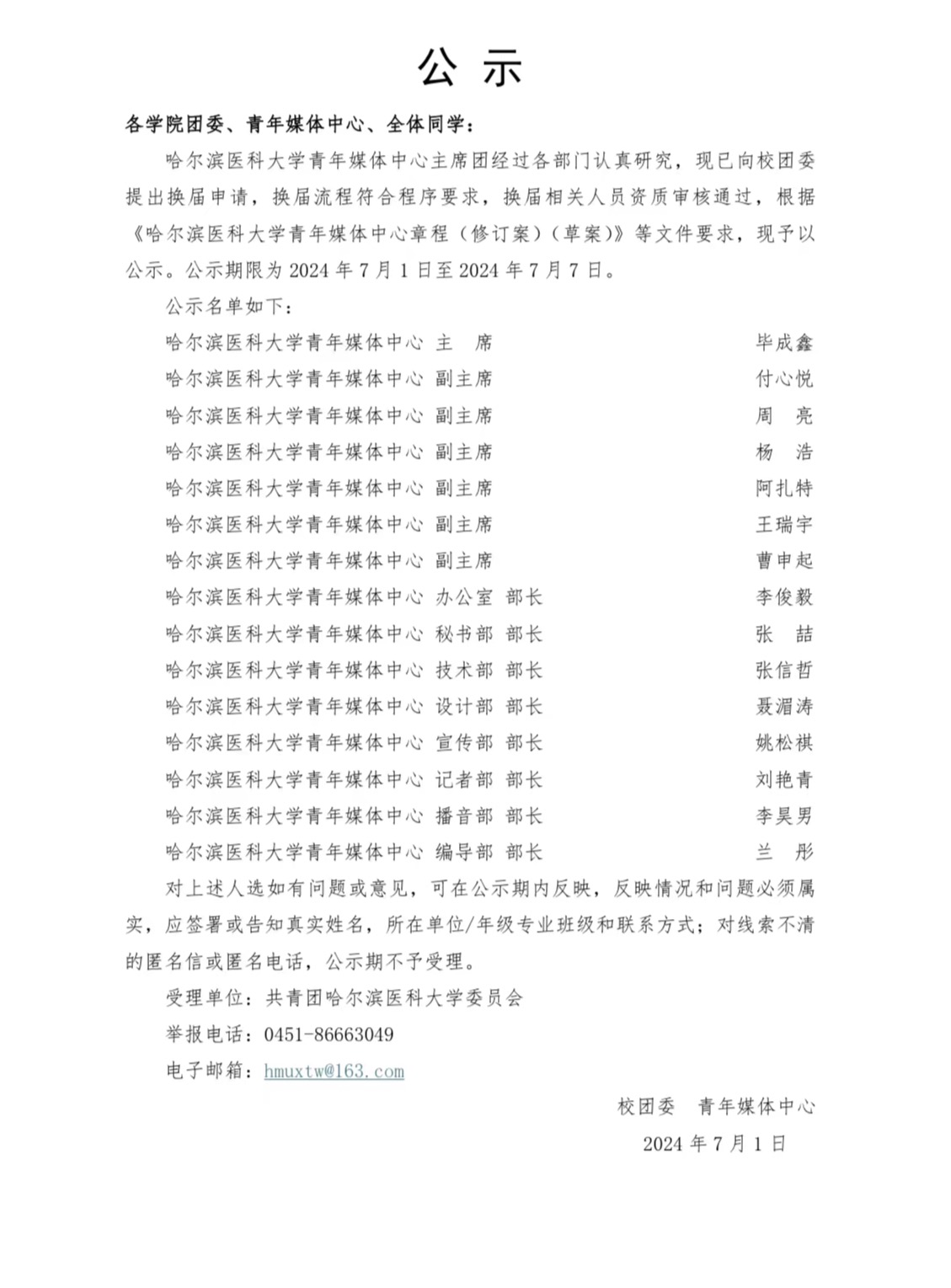 ac米兰官网中文网站青年媒体中心主席团经过各部门认真研究,现已向校团委提出换届申请,换届流程符合程序要求,相关人员资格审查通过,现予以公示。
