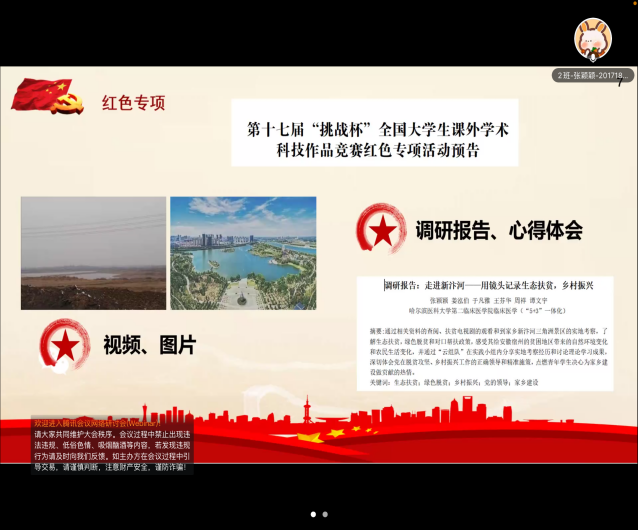 为激发我院大学生的创新精神和创业意识,提升大学生的综合素质,加强我院“挑战杯”大学生创业计划竞赛指导工作,ac米兰官网中文网站二院团委于2022年3月9日18:00在线上召开ac米兰官网中文网站二院第十三届“挑战杯”中国大学生创业计划竞赛经验分享会暨挑战杯宣传启动会议,医大二院副院长付然、黑龙江省大学生创新创业训练计划项目导师曲利军、往届获奖学生代表参加本次会议,本次会议由医大二院团委副书记周明珠主持。