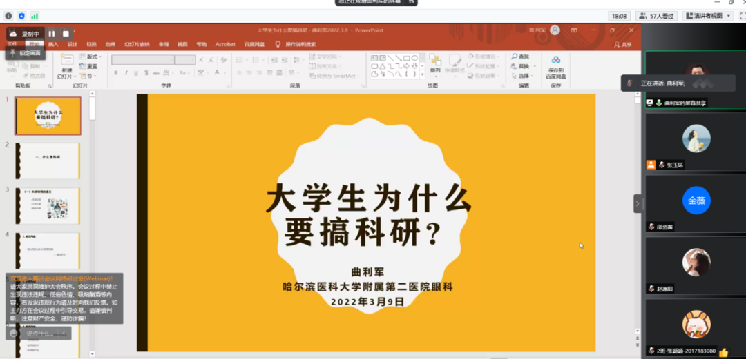 黑龙江省大学生创新创业训练计划项目导师曲利军从科研的内容、科研对医学生的意义等方面详细地分享了大学生为什么要搞科研。