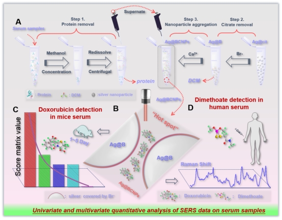 表面增强拉曼光谱(SERS)广泛应用于药物分子的检测。SERS检测血清中药物分子时,由于血清具有高SERS背景噪声,可以掩盖药物分子的信号,因此获得药物分子高灵敏度和重复性的拉曼信号是一个严峻的挑战。该成果创新性设计了一种三步制备银纳米粒子簇SERS检测的方法。通过选择聚集剂和内标物,观察到内标物和六种不同药物分析物清晰的SERS特征峰信号,可用于人血清中药物检测及农药中毒的鉴定。值得注意的是,通过内标物和药物分析物SERS特征峰的比值实现了对小鼠血清中药物代谢的单变量定量监测,这与多元曲线分辨-交替最小二乘法的分析一致。该方法在治疗药物监测和个性化医疗方面显示出巨大的临床应用潜力。