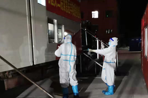 此次援助望奎县,ac米兰官网中文网站二院派出了高水平的技术队伍和“汽车医院”的技术设备,但仍然遭遇了许多从未经历过的难题。望奎县地广人稀,许多村镇位置分散,乡间路远难行,核酸样本采集只能在白天进行,导致样本检测就只能在夜间开展。时值隆冬,东北的夜间温度低达零下三十多度,对移动检测设备的运行、实验消杀、感染防护、样本交接等流程都造成了严重影响。为了保障设备正常工作,一些工作间的温度仅为16度,还有一些检测人员在三级防护状态下,整个夜间要持续坚持工作6-8小时。队员们要在零下三十度的隔离区穿脱防护服,严格进行感染防护流程,每进行一步手消毒,都经历一次麻木和刺痛,整个团队无论是在技术上还是身体上都经历了前所未有“极限挑战”。