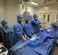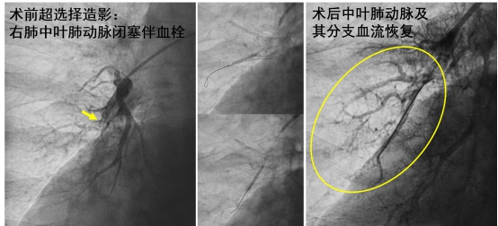 进行抗凝药物治疗还是积极的手术治疗?刘炳辰团队再次进行了讨论、分析及评估,考虑到患者高龄、晕厥频率高,可能会导致二次伤害,且肺CT显示肺栓塞已向肺梗死进展,与患者家属充分沟通后,决定为郑大爷进行介入手术治疗。术中,刘炳辰团队先对心脏冠状动脉进行造影,患者无明显狭窄,排除了急性冠脉综合征。随后在肺动脉造影中发现右肺中叶动脉闭塞,刘炳辰立刻为患者施行了球囊扩张术,术后患者血流恢复、肺动脉压降低,氧分压明显提升,肺CT显示右肺中叶实变影消失。术后三日患者顺利出院。
