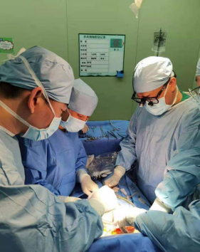 普外科主任崔云甫教授(右)和胆胰外科苏志雷副教授(左2)应用经肝脏动脉灌注驱血技术完成巨大肝肿瘤切除