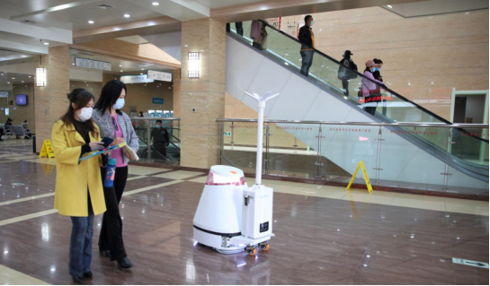 两名就诊的女士好奇的观看门诊大厅的消毒机器人