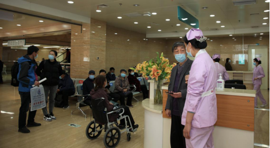 志愿者为每一名进入门诊大厅的患者进行手消毒