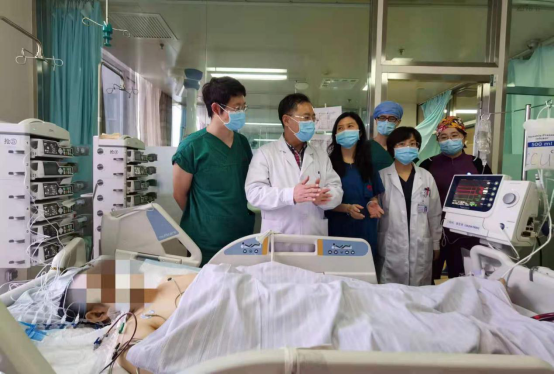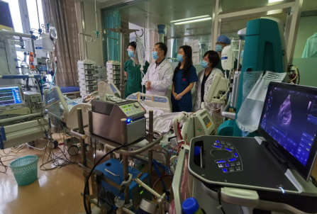 于波教授(左2)和杨爽教授(左3)对正在接受ECMO治疗的重症心肌炎患者病情进行讨论