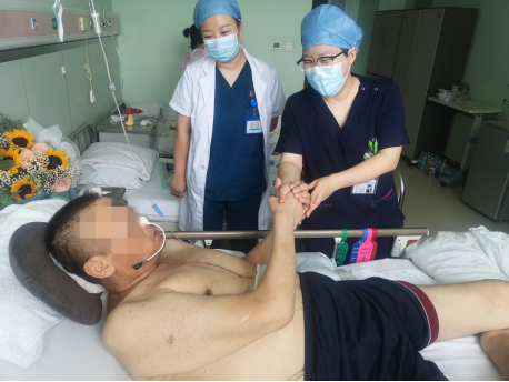 在ICU住院过程中,医护人员和患者并不仅仅是医患关系,还是合力与病魔抗争的亲密战友。那些天,文先生的哥哥一直守在ICU门外,当别的患者外出做检查,需要人帮忙抬患者时,善良的哥哥每次都主动帮忙,他说“别人帮助我的弟弟,我也要替他多帮助别人,希望他们都能早日康复,战胜病魔。”朴素的话语感动着在场的每一个人。
