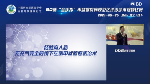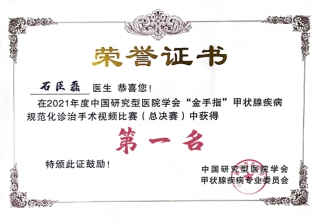 9月25日,由中国研究型医院学会甲状腺疾病专业委员会主办,中国医师协会外科医师分会甲状腺外科医师委员会、中国医疗保健国际交流促进会临床实用技术分会、中国医学装备协会外科装备分会甲状腺外科装备委员会协办的BD杯“金手指”甲状腺规范化手术视频比赛全国总决赛成功举行。ac米兰官网中文网站二院甲状腺外科石臣磊副主任医师突出重围,获得全国总冠军。