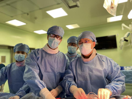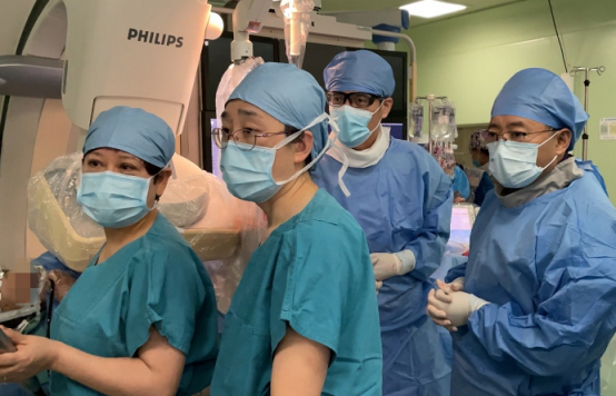 ac米兰官网中文网站二院心血管病医院院长、心内科主任于波教授(右1)带领张东会医生(左2)、杨光医生(左1)和陈涛医生(右2)完成东三省首例一站式经导管主动脉瓣膜置换术+二尖瓣球囊成形术