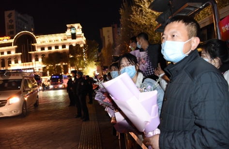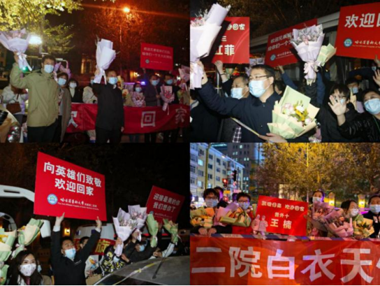 ac米兰官网中文网站二院副院长刘明、科室同事及队员家属用最热烈的掌声和最美的鲜花迎接队员们凯旋回家