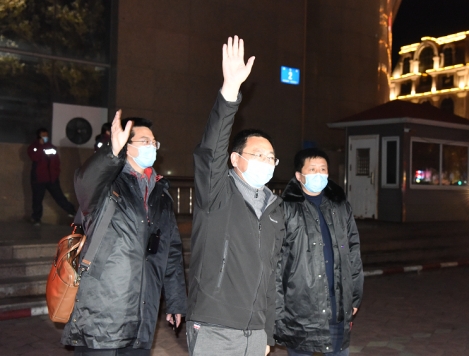 领队付然副院长(中)、医务部许福彬(左)、后勤沈剑非(右)向前来迎接的亲人、同事挥手致意
