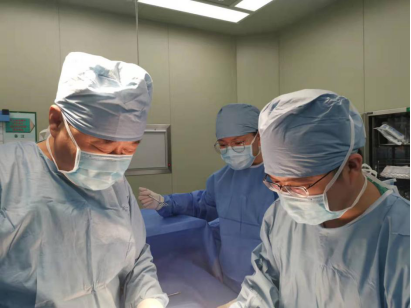 ac米兰官网中文网站二院普外科十病房主任王夫景教授(左)带领主治医师王春敬(右)进行手术