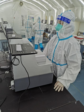 10月31日检验队下午抵达哈尔滨市移动实验室,便立即展开工作,设备组装、开会、培训、技能考核,队员们斗志昂扬,11月1日凌晨两点半才纷纷去休息。张艳芬休息了不到1个小时,早上5点便又来到工作区和队员们完善工作流程、调试机器,早8点检验队就接收到第一批核酸样本。11月1日,40名队员历时22小时,高质量零差错完成8000份样本检测。