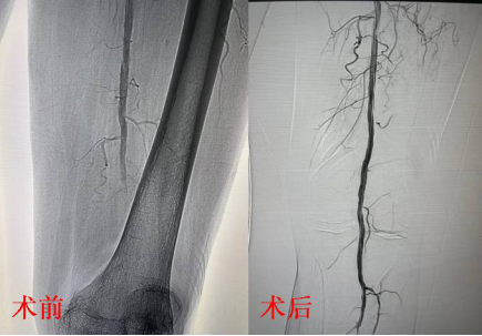 王大爷的术中造影显示,右侧股动脉近膝关节处完全阻塞,闫䶮当机立断用AngioJet机械血栓抽吸技术为王大爷抽栓治疗。王大爷术后恢复明显,右侧下肢颜色明显好转,皮温正常。